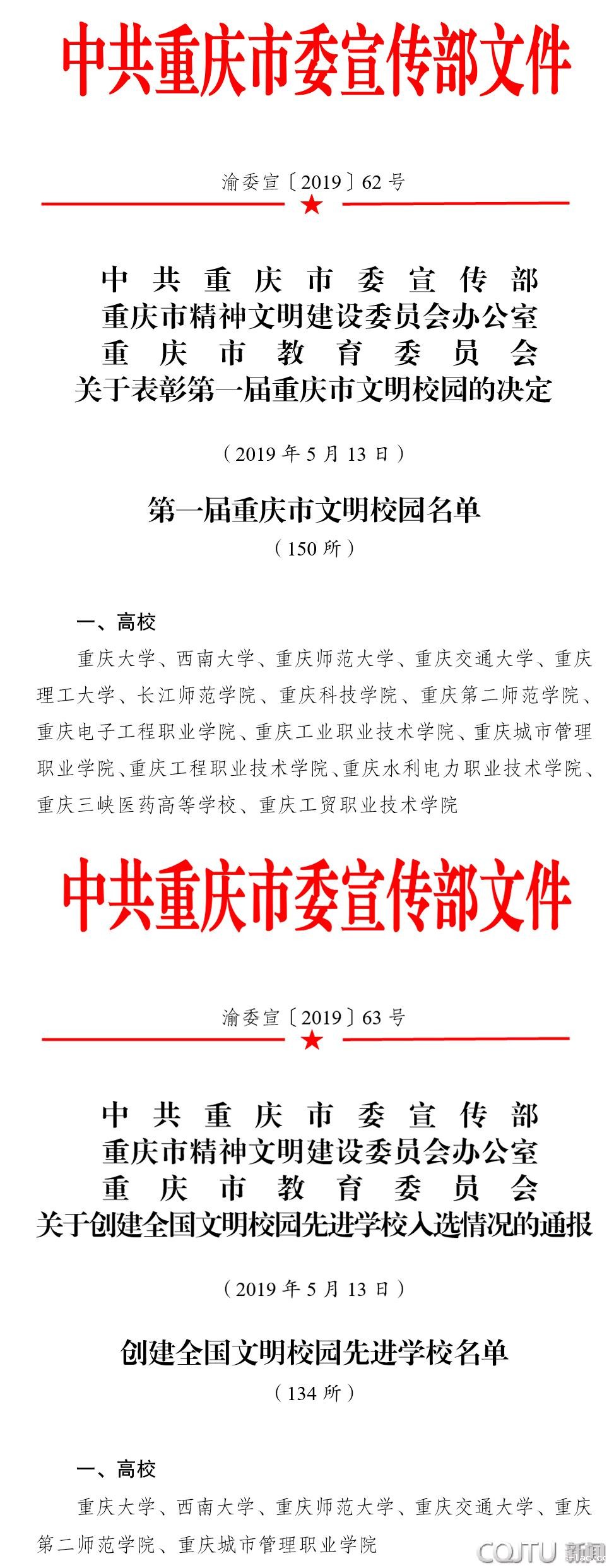 近日,中共重庆市委宣传部、重庆市精神文明建设委员会办公室、重庆市教育委员会联合印发了《关于表彰第一届重庆市文明校园的决定》(渝委宣〔2019〕62号)和《关于创建全国文明校园先进学校入选情况的通报》(渝委宣〔2019〕63号)文件,表彰一批校园环境优雅、文化底蕴浓厚、办学特色鲜明的文明校园,并通报了经中央文明办、教育部确定的创建全国文明校园先进学校名单,老伟德网上娱乐均名列其中。