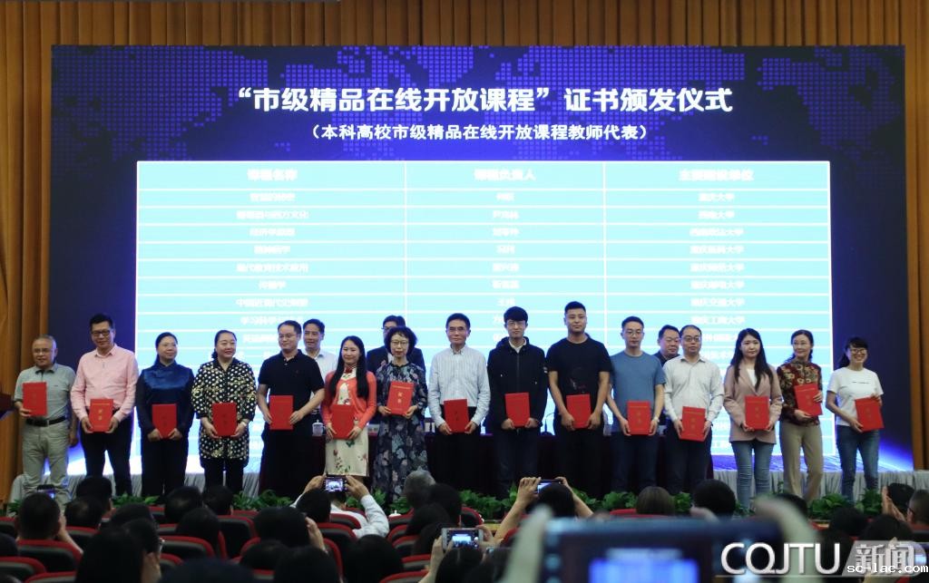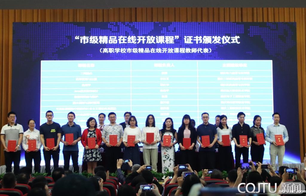 市教育技装中心党总支书记、市课程协作组副主任姚友明宣读了重庆市第二批高校精品在线开放课程认定结果,共有122门课程认定为市级精品在线开放课程。主席台领导为30位教师代表颁发了市级精品在线开放课程认定证书。