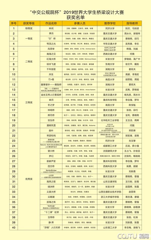 作为2019世界交通运输大会的重点活动之一,2019世界大学生桥梁设计大赛由中国公路学会、中交公路规划设计院有限公司联合主办,具有广泛的影响力。此次大赛,国内65所大学,美国、德国、意大利、日本、比利时等国的14所大学选送参赛作品共计266件,参赛选手包括了博士、硕士研究生在内的各学历层次学生1179人。