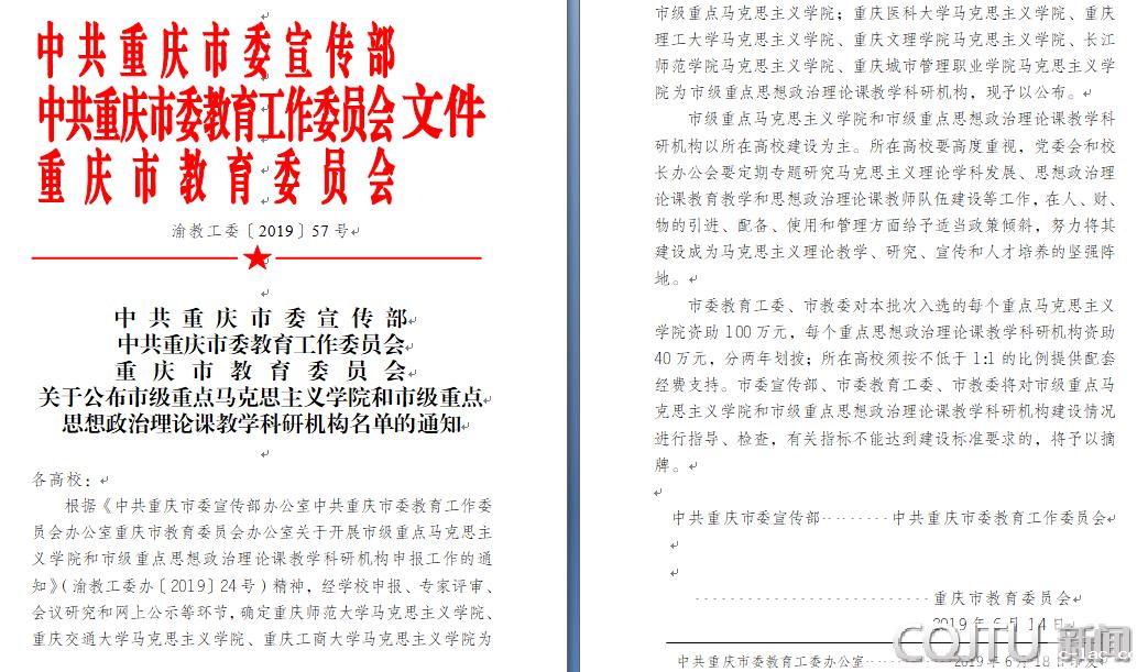 近日,市委宣传部、市委教育工委和市教委联合印发《关于公布市级重点马克思主义学院和市级重点思想政治理论课教学科研机构名单的通知》,我校马克思主义学院获批重庆市重点马克思主义学院。