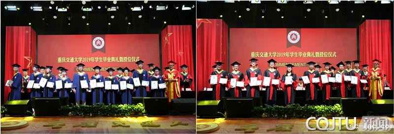 校领导为本科、硕士、博士毕业生代表们颁发毕业证书和学位证书,校长、校学位评定委员会主席唐伯明教授为获得学位的毕业生代表们拨穗授位。