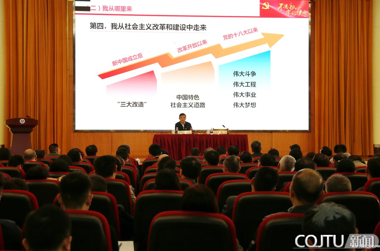 10月30日上午,校党委书记李天安在南岸校区多功能厅作“不忘初心、牢记使命”主题教育《践行初心使命,勇担时代重任,以实干实绩为党育人为国育才》专题党课宣讲。市委巡回指导十三组组长皮晓青到会指导。全体校领导、校党委常委,全校副处级及以上领导干部、党支部书记、师生党员代表340余人到场聆听。