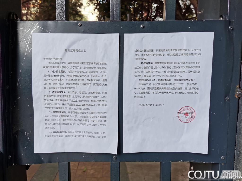 1月29日上午,学校批量复印了《关于校园安全管理的通告》和《关于新型冠状病毒感染的肺炎疫情防控期间有关事项的通知》,并于同日下午起在双福校区、南岸校区各校门、楼栋分别张贴,同时,还在各校门口将《通知》发放给进出师生员工。