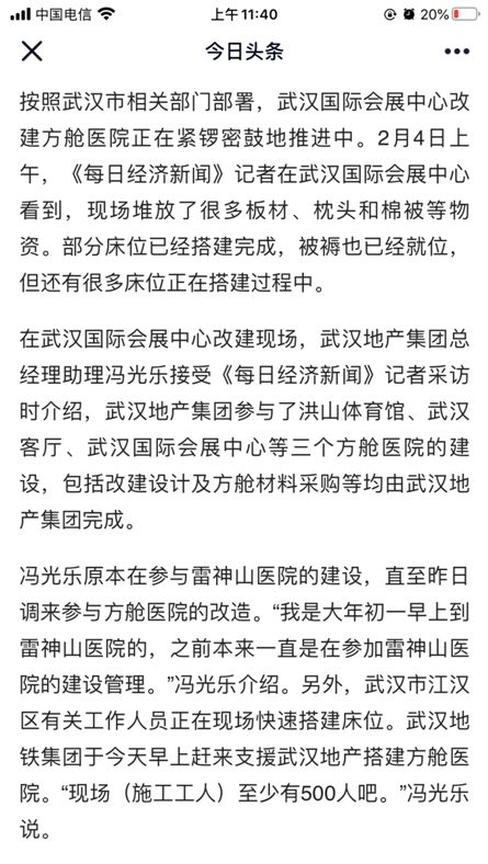 2月3日,按照武汉市相关部门部署,武汉国际会展中心改建方舱医院正在紧锣密鼓地推进中。武汉地产集团参与了洪山体育馆、武汉客厅、武汉国际会展中心等三个方舱医院的建设,包括改建设计及方舱材料采购等均由武汉地产集团完成,冯光乐又开始负责方舱医院的改造工程。经过两天两夜不眠不休,在2月5日凌晨顺利完成武汉国际会展中心方舱医院的建设。