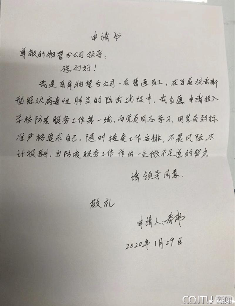 “我自愿加入抗击新型冠状病毒防控一线战斗,不论生死,不计报酬,保护交大师生员工的生命健康……”这是1月30日,后勤服务总公司员工杨大全递交的一份请战书。