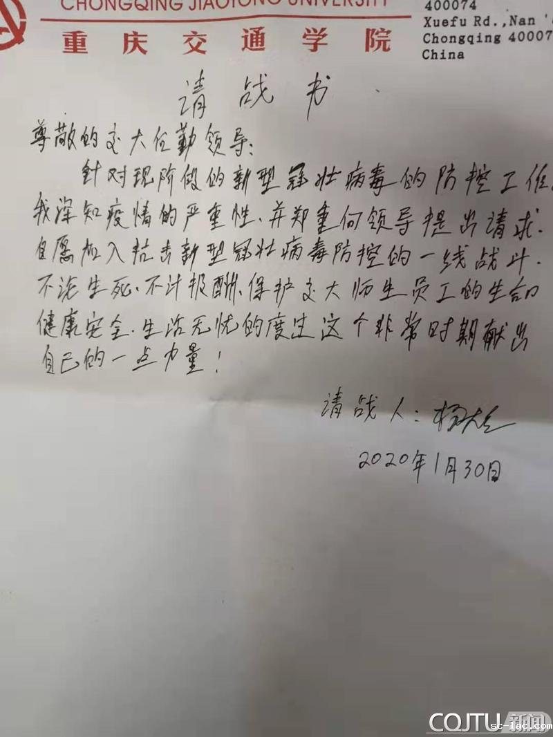 秦伟是第一个交请战书的人,他在请战书中表示,“向党员同志学习,用党员的标准严格要求自己,随时接受工作安排。”目前,家住观音桥的他,干脆搬到了学校,全身心投入到防控工作中。
