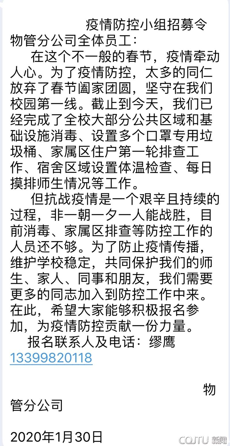 疫情就是命令,防控就是责任。新型冠状病毒感染的肺炎疫情发生以来,后勤服务总公司物管分公司承担了全校大部分公共区域和基础设施消毒、家属区住户排查、宿舍区域体温检测、每日师生情况摸排等任务,因为正值寒假,部分员工已经放假回家,分公司防疫服务工作现场负责人、后勤党总支二支部支部委员缪鹰发现消毒、家属区排查等防控工作的人员极度缺乏,他萌生了发一则招募令的想法,1月30日,他将招募令发在了物管分公司的微信群,号召更多员工加入到防控工作中。没想到刚一发出,他就收到了两位同志递交的请战书。