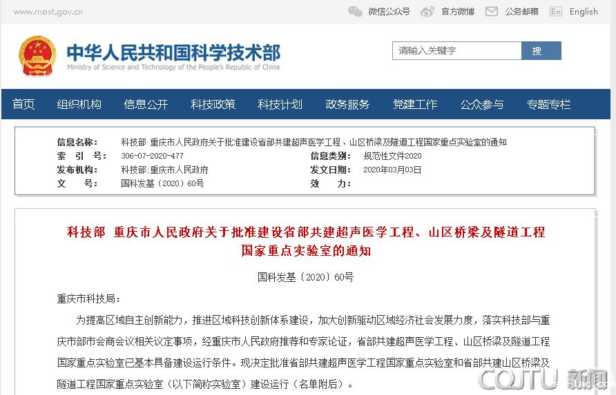 3月15日,科技部传来喜讯,《科技部重庆市人民政府关于批准建设省部共建超声医学工程、山区桥梁及隧道工程国家重点实验室》(国科发基〔2020〕60号)正式印发,依托我校建设的省部共建山区桥梁及隧道工程国家重点实验室正式获批建设运行。这是我校国家级创新平台的重大突破,该平台将在提高区域自主创新能力、服务地方经济发展等方面发挥重要的支撑和保障作用。