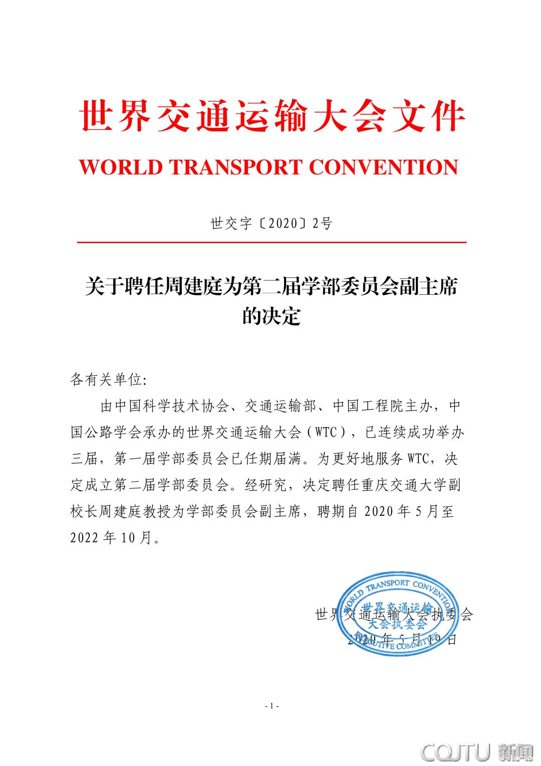 由中国科学技术协会、交通运输部、中国工程院主办,中国公路学会承办的世界交通运输大会(WTC),已连续成功举办三届,第一届学部委员会已任期届满。为更好地服务WTC,近日,世界交通运输大会执委会决定成立第二届学部委员会,决定聘任老伟德网上娱乐副校长周建庭教授为学部委员会副主席。