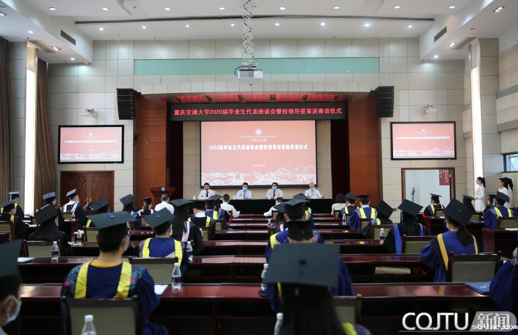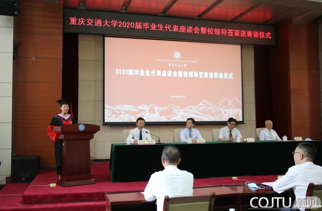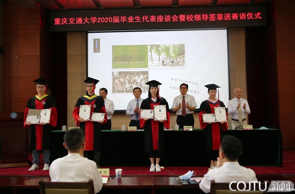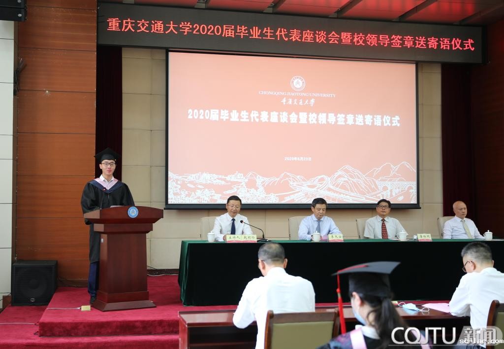 “风华四年、交大有你,不畏山海、载梦远航!”6月23日,2020届毕业生代表座谈会暨校领导签章送寄语仪式在学校南岸校区举行。“毕业不是结束,而是新的开始”,会上,毕业生代表们思绪万千,尽情吐露对母校的感激、感恩之情。校领导李天安、唐伯明、赵明阶、黄承锋出席座谈会;校党政办、学工部、研究生院、教务处负责人,毕业生代表等90余人参加座谈。