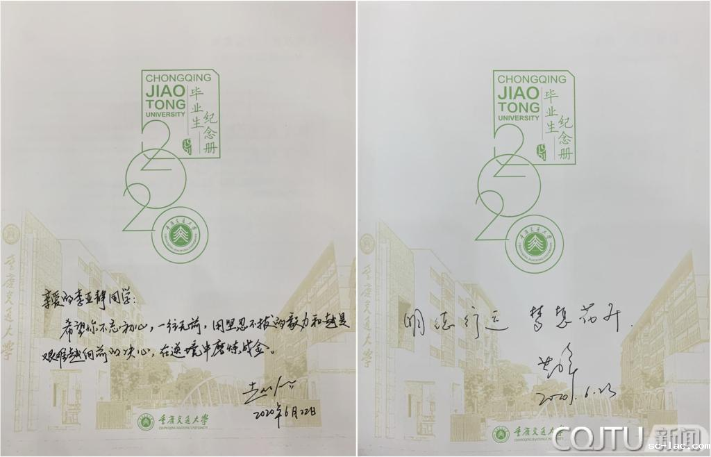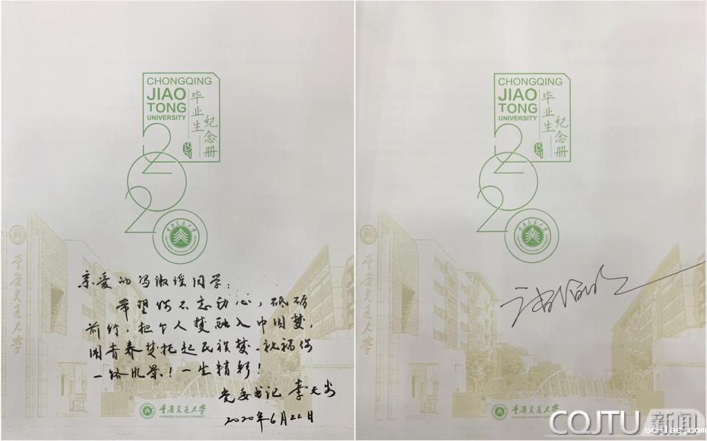 特写:为毕业生代表发放学历学位证书、赠送毕业生纪念册环节,校党委书记李天安、校长唐伯明、副校长赵明阶、副校长黄承锋为毕业生代表们提前在毕业生纪念册上书写了毕业寄语并签名留念。衷心祝愿学校全体毕业生日新月异、蒸蒸日上,为人生添彩、为母校争光。
