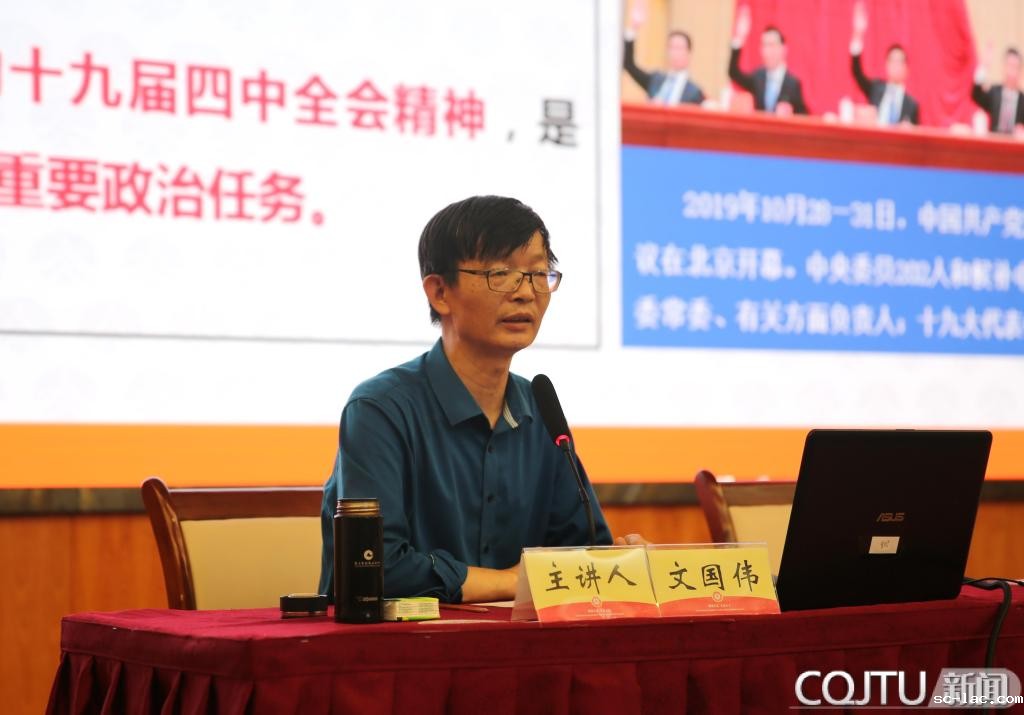 “党的十九届四中全会,是党站在‘两个一百年’奋斗目标历史交汇点上、在新中国成立70周年之际、在我国处于中华民族伟大复兴的关键时期召开的一次具有开创性、里程碑意义的重要会议。学习宣传贯彻党的十九届四中全会精神,是当前和今后一个时期的重要政治任务。”文国伟教授从党的十九届四中全会召开背景以及重大意义展开讲述,对党的十九届四中全会精神作出深刻解读。