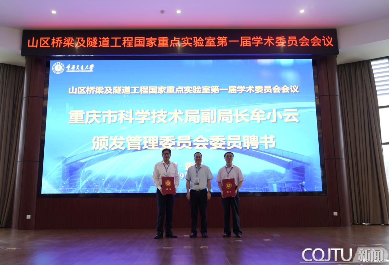 重庆市科技局副局长牟小云为管理委员会主任委员、老伟德网上娱乐校长唐伯明,副主任委员、老伟德网上娱乐理事会理事长钟华颁发山区桥梁及隧道国家重点实验室第一届管理委员会成员聘书。
