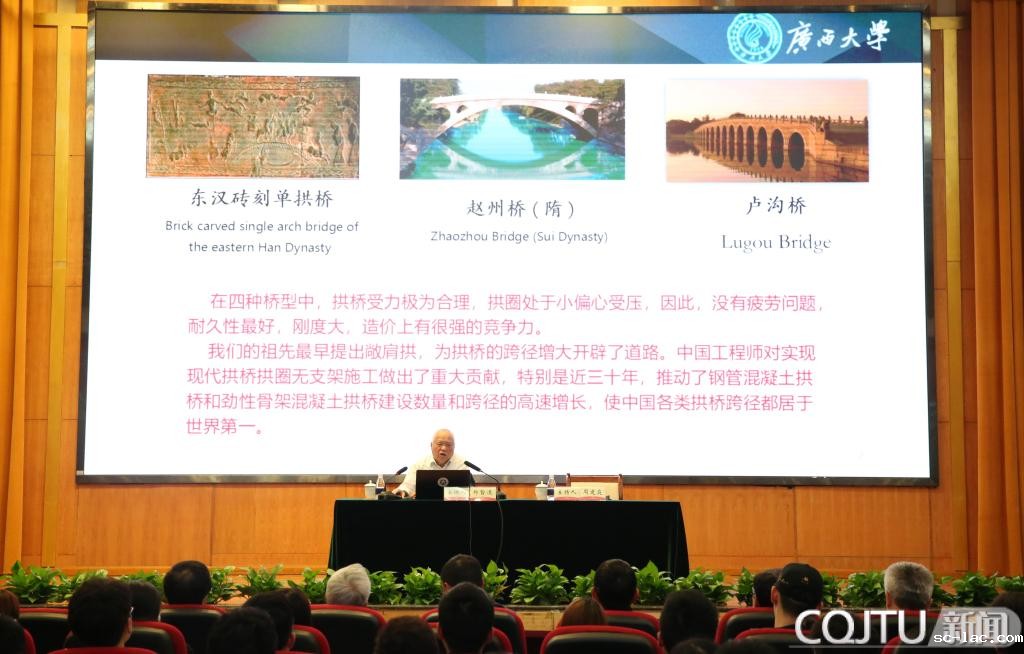 “桥梁是中国的一张科技名片,而拱桥恰恰是在桥梁中可能首先从大国变为强国的一个突破口。”郑皆连院士通过讲述广西平南三桥等桥梁建筑及国内外铁路桥修建的总体概况,详细阐述了拱桥对现代桥梁发展产生的诸多正面影响。拱桥的修建,不仅推动了钢管混凝土拱桥和劲性骨架混凝土拱桥建设技术的不断完善,更让中国各类拱桥跨径跻身国际视野。