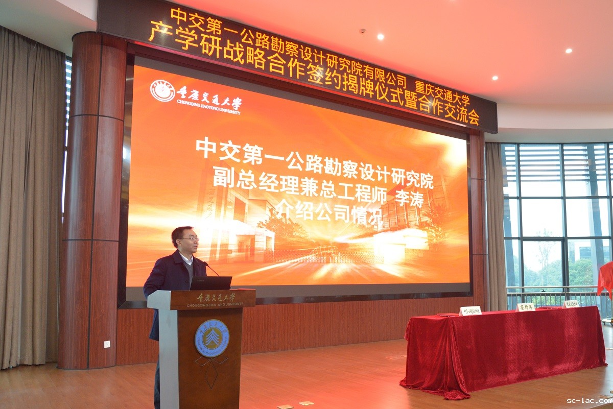 周建庭副校长简要介绍了学校的历史发展沿革、学科专业、人才培养、科研平台建设、标志性科技成果等方面的基本情况,并从深化校企协同育人、强化联合科技攻关、携手共建中国西部(重庆)科学城、助力学校实施“1231”行动计划、面向重大需求共同开展科技攻关共同服务西南交通主战场等方面提出了未来校企战略合作的重点领域与具体方向。周建庭表示,中交第一公路勘察设计研究院有限公司是国内一流、国际知名的工程咨询集团公司,在交通工程咨询、勘察、设计、研究等领域具有突出的全产业链优势,期望校企以此次签约为契机,双方共同聚焦川藏、青藏通道复杂环境下公路工程建设运维关键技术、聚焦山区公路复杂工程控制和全生命周期科学管养关键技术、聚焦两路精神深挖交通行业文化建设,校企紧密携手协同创新,力争产出重大科研成果。此外,校企双方还可在平台建设、试验检测、设计监理、成果转化等方面开展全业务领域合作,共同推进校企深度融合、协同发展。