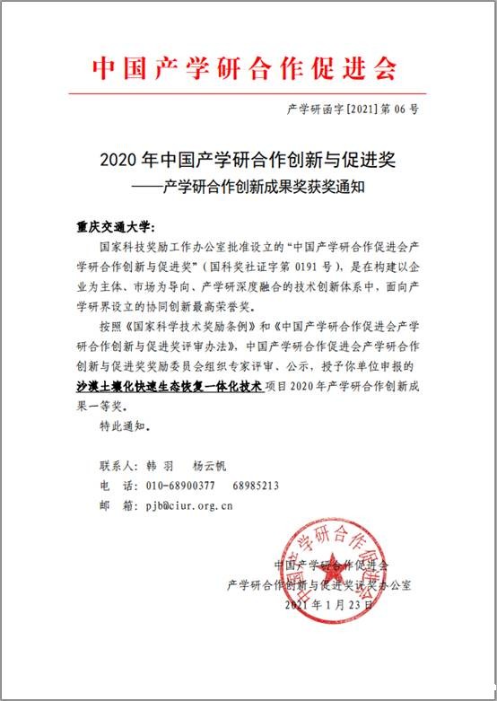 近日,接中国产学研合作促进会《2020年中国产学研合作创新与促进奖一产学研合作创新成果奖获奖通知》(产学研函字[2021]第06号),我校申报的沙漠土壤化快速生态恢复一体化技术项目荣获2020年产学研合作创新成果一等奖。