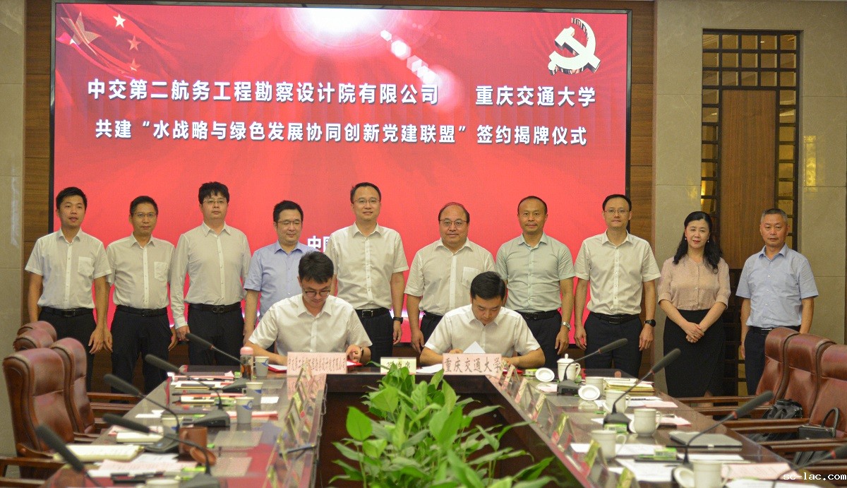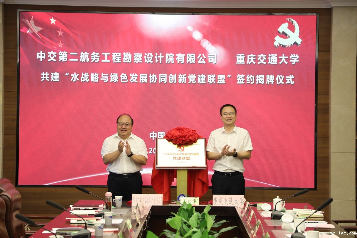 中交二航院航运工程事业部总经理王平、河海学院港口航道与海岸工程系副主任张鹏代表共建支部签署了共建“水战略与绿色发展协同创新党建联盟”协议,宫辉书记、宋文涛董事长共同为“水战略与绿色发展协同创新党建联盟”揭牌。
