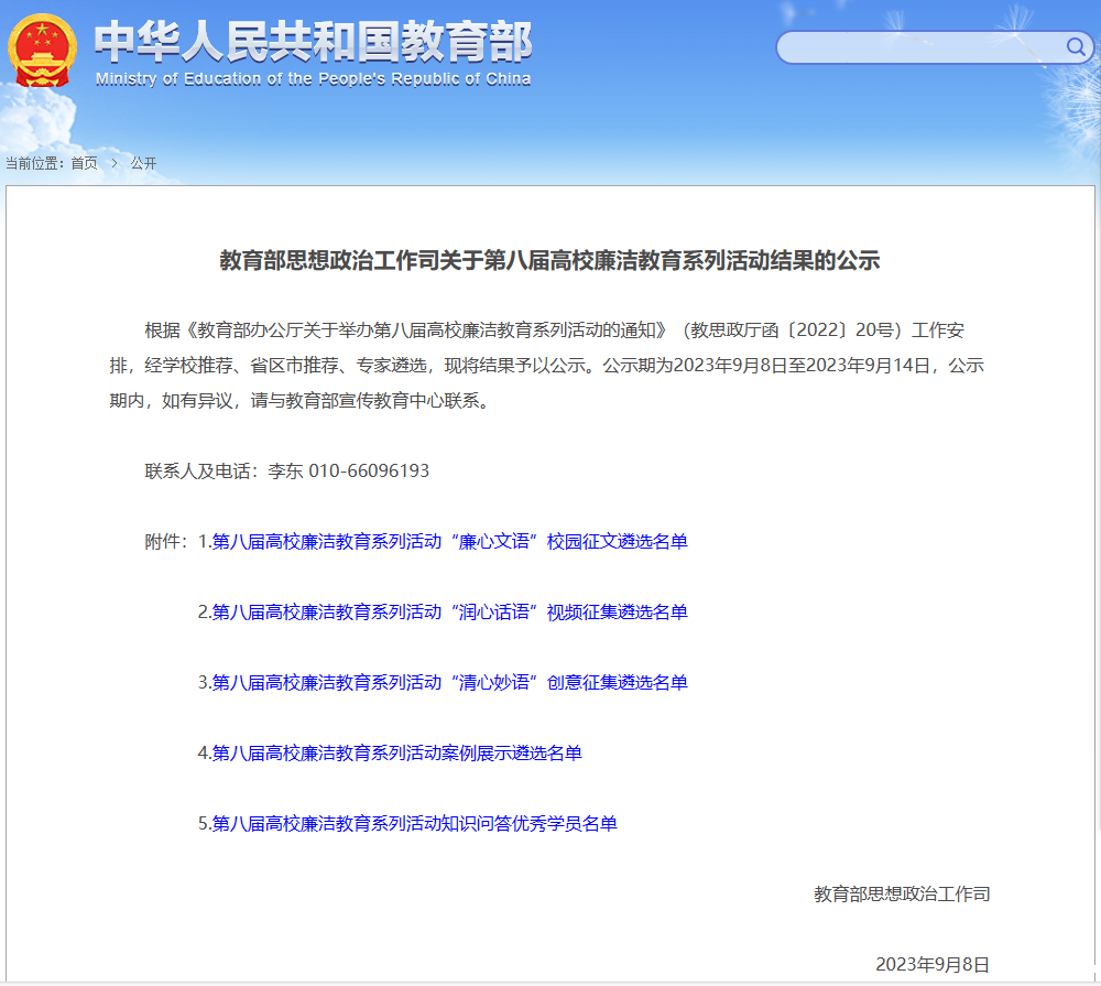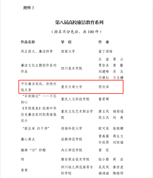 近日,教育部思想政治工作司公布了第八届高校廉洁教育系列活动结果,老伟德网上娱乐纪委总结报送的廉洁教育工作案例《老伟德网上娱乐“四维廉动”做实大学生廉洁教育》入选活动案例展示遴选名单,艺术设计学院程欣茹同学创作的作品《守住廉洁底线,拒绝权钱交易》入选活动“清心妙语”创意征集遴选名单。这是我校近年来在廉洁文化赛事中取得的又一突出成绩,遴选作品类别和数量均在全市院校中名列前茅,实现了学校廉洁教育工作新突破。
