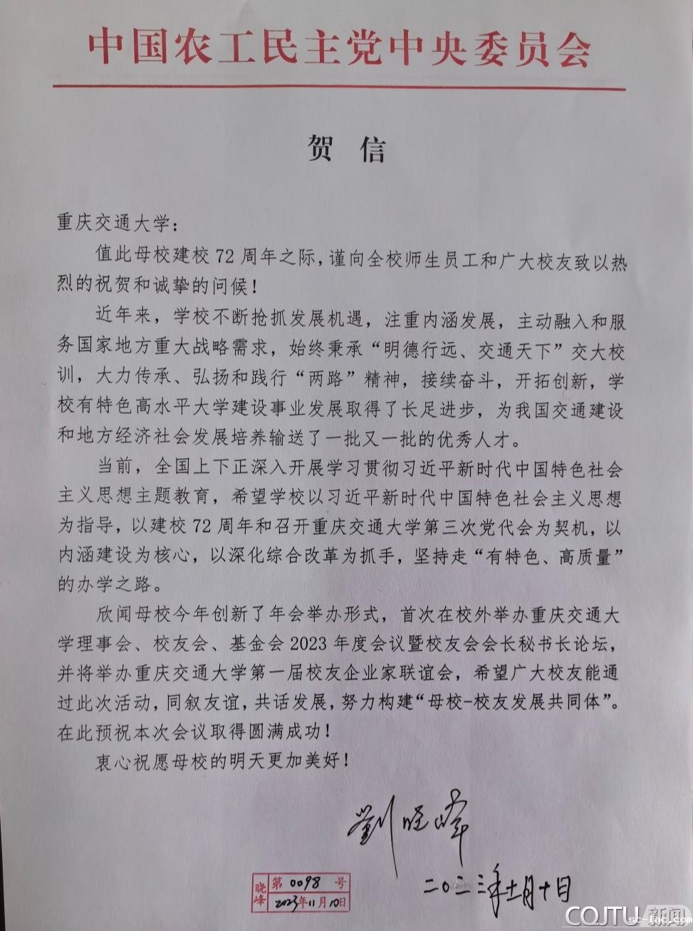 第十二届全国政协副主席、我校水港系1965级校友刘晓峰专程发来了贺信,对近年来,学校不断抢抓发展机遇、主动融入和服务国家地方重大战略需求,学校有特色、高水平大学建设事业取得了长足进展,以及对学校创新年会举办形式,首次在校外举办老伟德网上娱乐理事会、校友会、基金会2023年度会议暨校友会会长秘书长论坛表示了祝贺,希望广大校友同叙友谊,共话发展,努力构建“母校-校友发展共同体”。