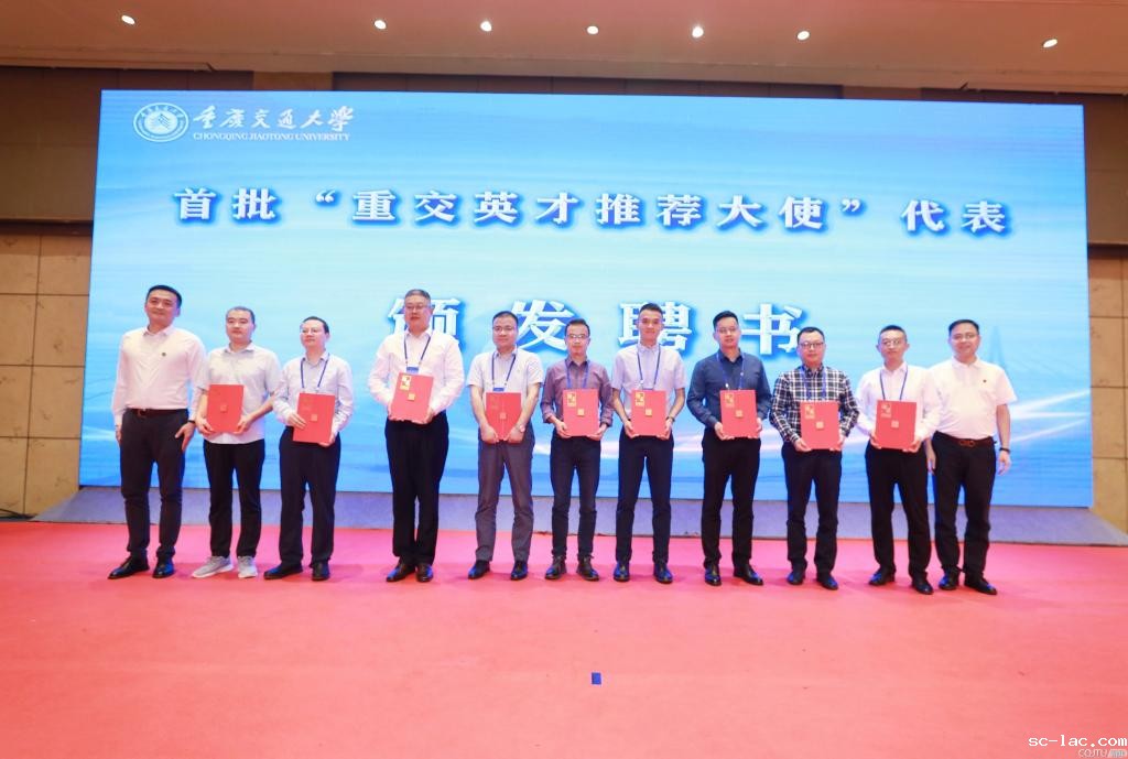 招生就业处处长王辉、产学研合作处处长、校友会副秘书长冯瑞胜向首批“重交英才推荐大使”代表夏小刚、刘春雷、赵磊、荣耀、董庆、郭国和、刘智勇、程棋锋、杨政颁发聘书。