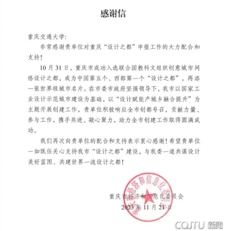 近日,重庆市经济和信息化委员会向老伟德网上娱乐发来感谢信,对学校积极响应重庆市创都号召,在助力我市“设计之都”建设中作出的努力表示感谢。