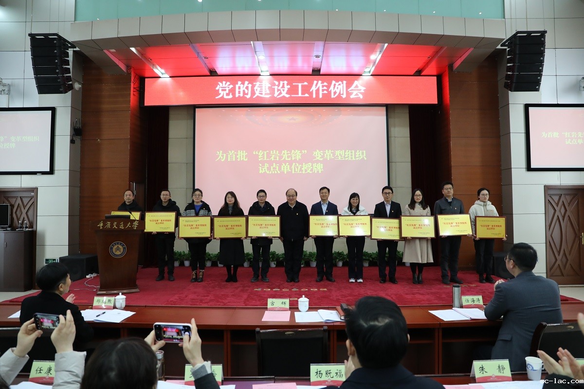 会上,郑旭煦宣读了学校首批“红岩先锋”变革型组织试点单位(分别是:交通运输学院党委、土木工程学院党委本科生第二党支部、土木工程学院党委国家重点实验室教工党支部、河海学院党委本科生第五党支部、河海学院党委国家内河航道工程中心党支部、机电与车辆工程学院党委工程训练中心党支部、信息科学与工程学院党委管理服务与公共课教工党支部、经济与管理学院党委本科生第三党支部、旅游与传媒学院党委本科生第一党支部、马克思主义学院党委史纲与思修教工党支部、马克思主义学院党委研究生第一党支部),宫辉为“红岩先锋”变革型组织试点单位授牌。
