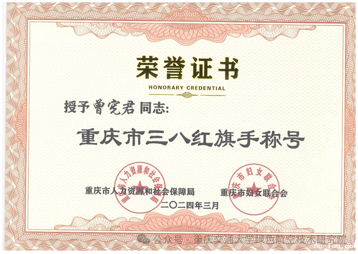 “致敬最美的她”,全市妇联在3月6日举行纪念“三八”国际妇女节暨表彰大会,绿色航空技术研究院院长助理、绿色航空科技(重庆)有限公司总经理曾宪君被授予重庆市“三八红旗手”称号。