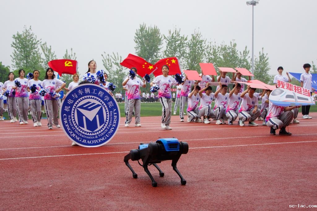 机电学院同学们以嘹亮的口号展现出“科技自强,我辈担当”的满腔自信;同行的DIY机械狗还跟随着他们“跳舞”。