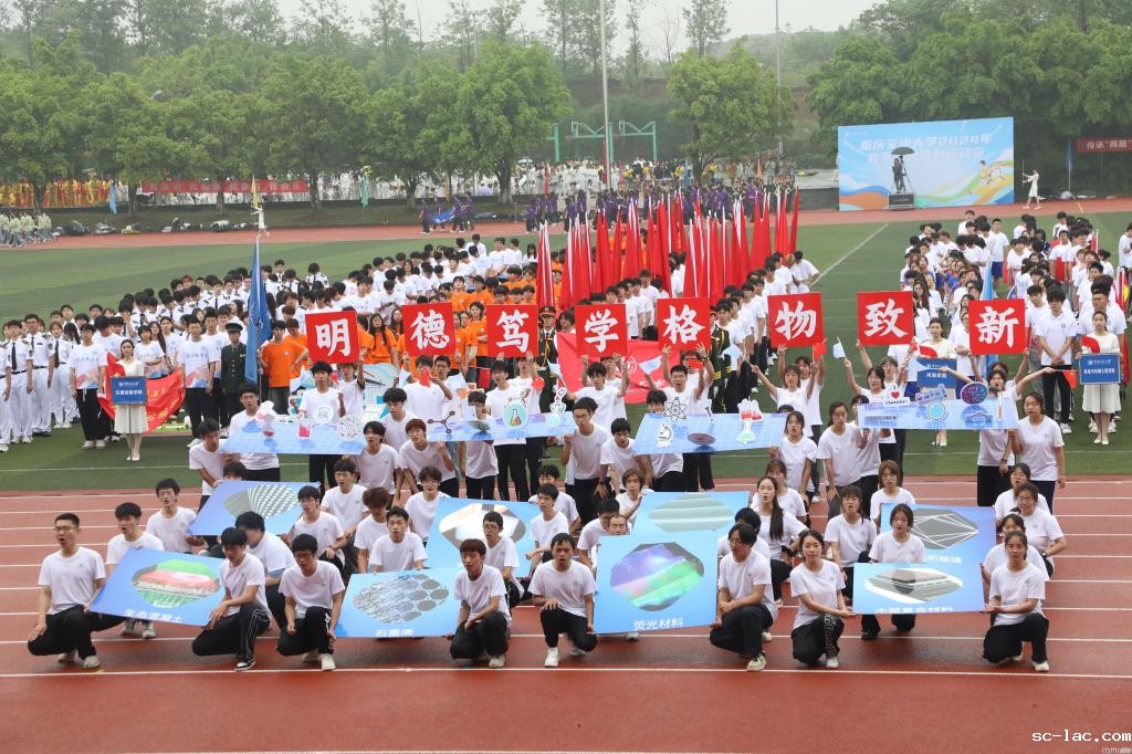 材料学院同学手持材料和仪器模型介绍,高喊着“明德笃学、格物致新,材力出鞘、铸就荣耀”,精气神十足。