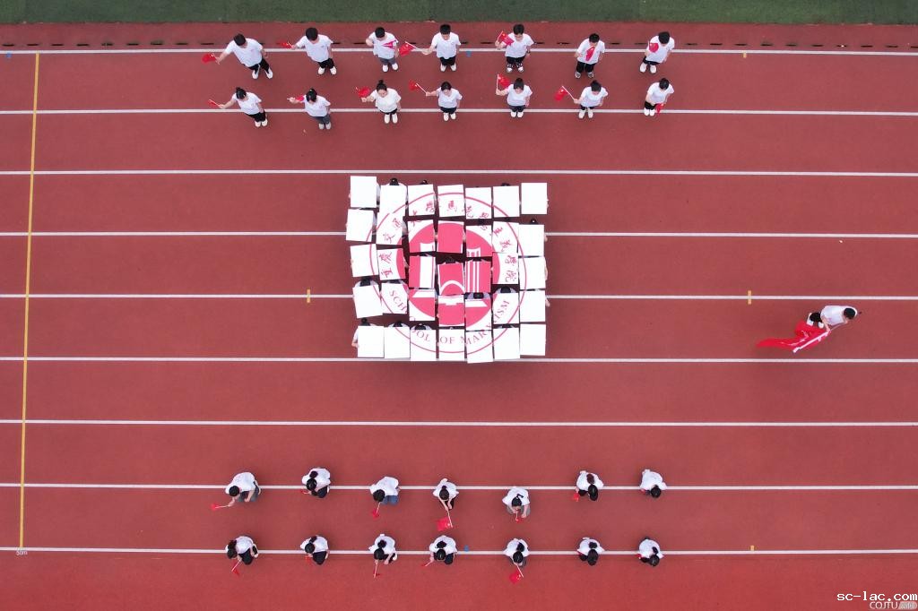 航运学院同学们运用蓝色布条,模拟出船舶在蔚蓝大海上乘风破浪的画面。