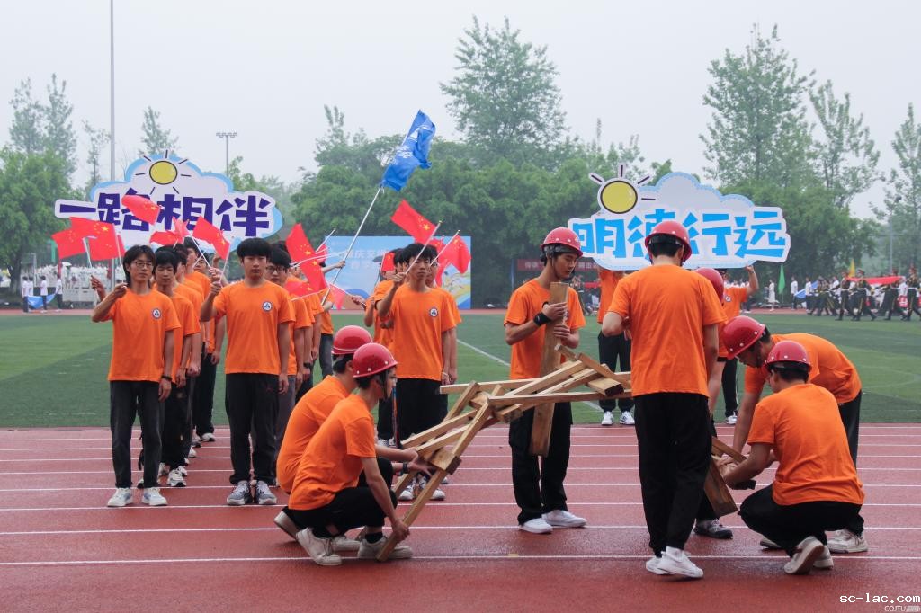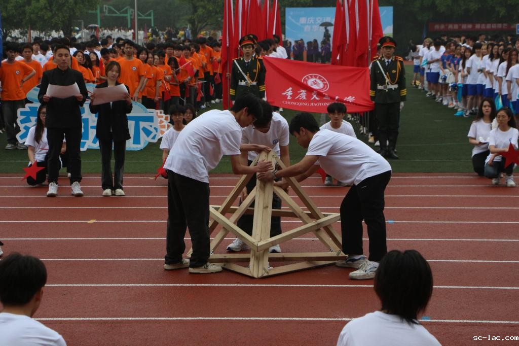 土木工程学院同学们头戴安全帽,模拟建设现场,用建筑木条在跑道上搭起了一座“拱桥”。