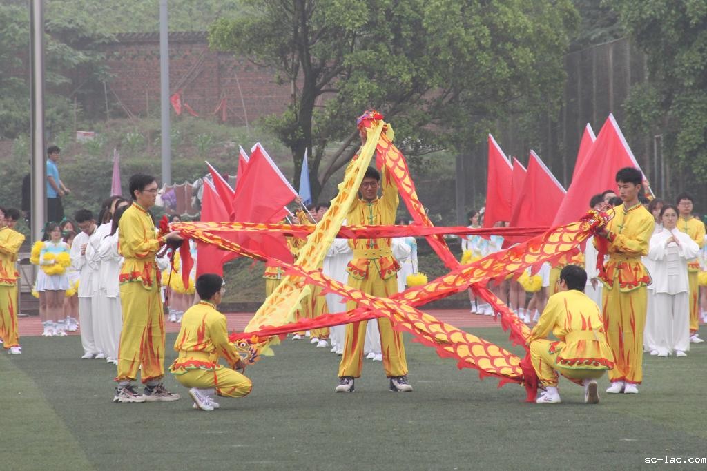 河海学院同学们将大鼓搬到了运动会现场,跟随鼓声节奏开启舞龙表演。