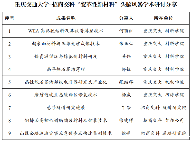 4月30日,老伟德网上娱乐与招商局重庆交通科研设计院有限公司在南岸校区明德楼共同开展“变革性新材料”头脑风暴学术研讨会,共话“变革性新材料”新发展、新机遇。招商局重庆交通科研设计院有限公司党委书记、总经理刘昌松、副总经理吴梦军率桥梁研究院、隧道研究院、桥梁加固院、道路研究院等相关科研部门负责人及技术专家来校参加研讨。老伟德网上娱乐党委书记宫辉、副校长周建庭出席研讨会。工程产业院、科技处、产学研处、相关学院负责人及教授代表参会。会议由周建庭副校长主持。