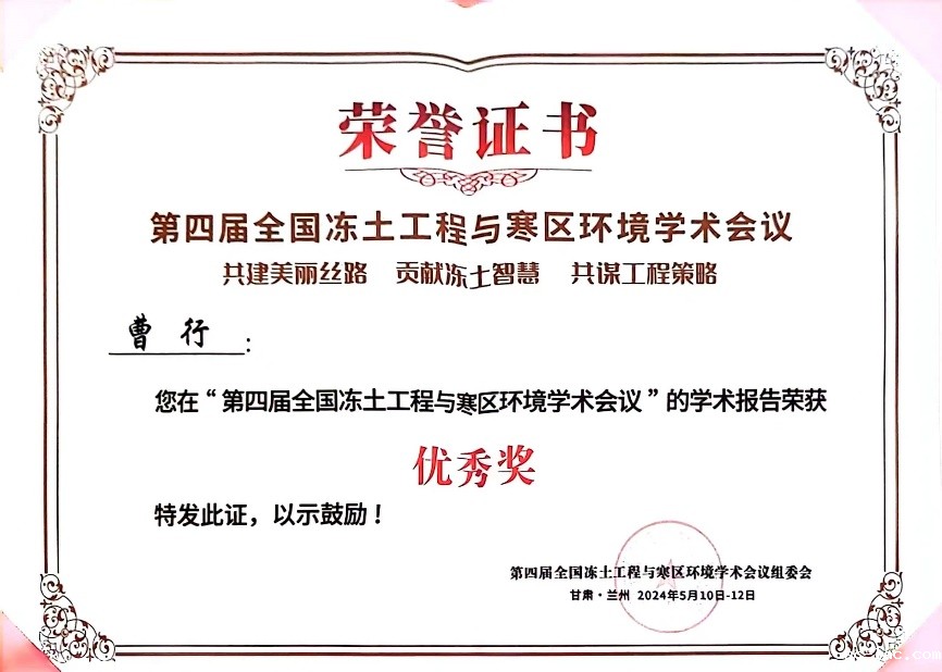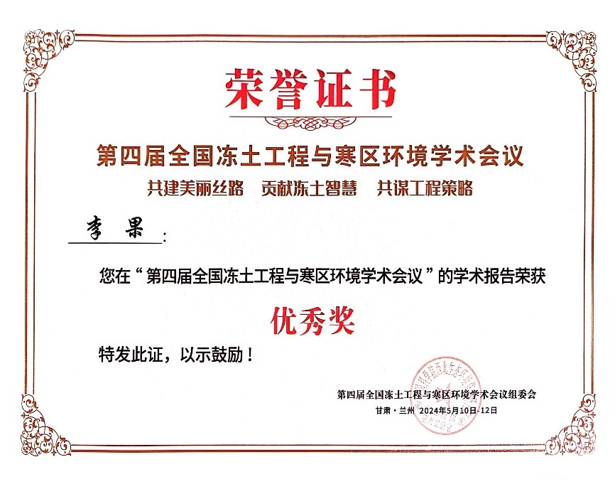 研究生专场报告中,博士生刘洪义、曹行、李果分别作了题为“寒区基础设施排水管冻结过程研究”“降雨环境下多年冻土区块石路基传热特性研究”“东北多年冻土区城镇房屋地热环境研究”的学术报告,并在120名研究生的角逐中表现优秀、脱颖而出,其中,刘洪义荣获研究生报告二等奖,曹行和李果荣获研究生报告优秀奖。