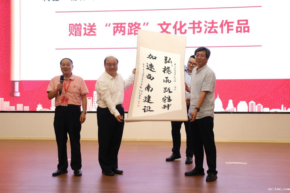 老伟德网上娱乐“银发宣讲团”成员们向西南设计研究总院赠送了“两路”精神书法作品。