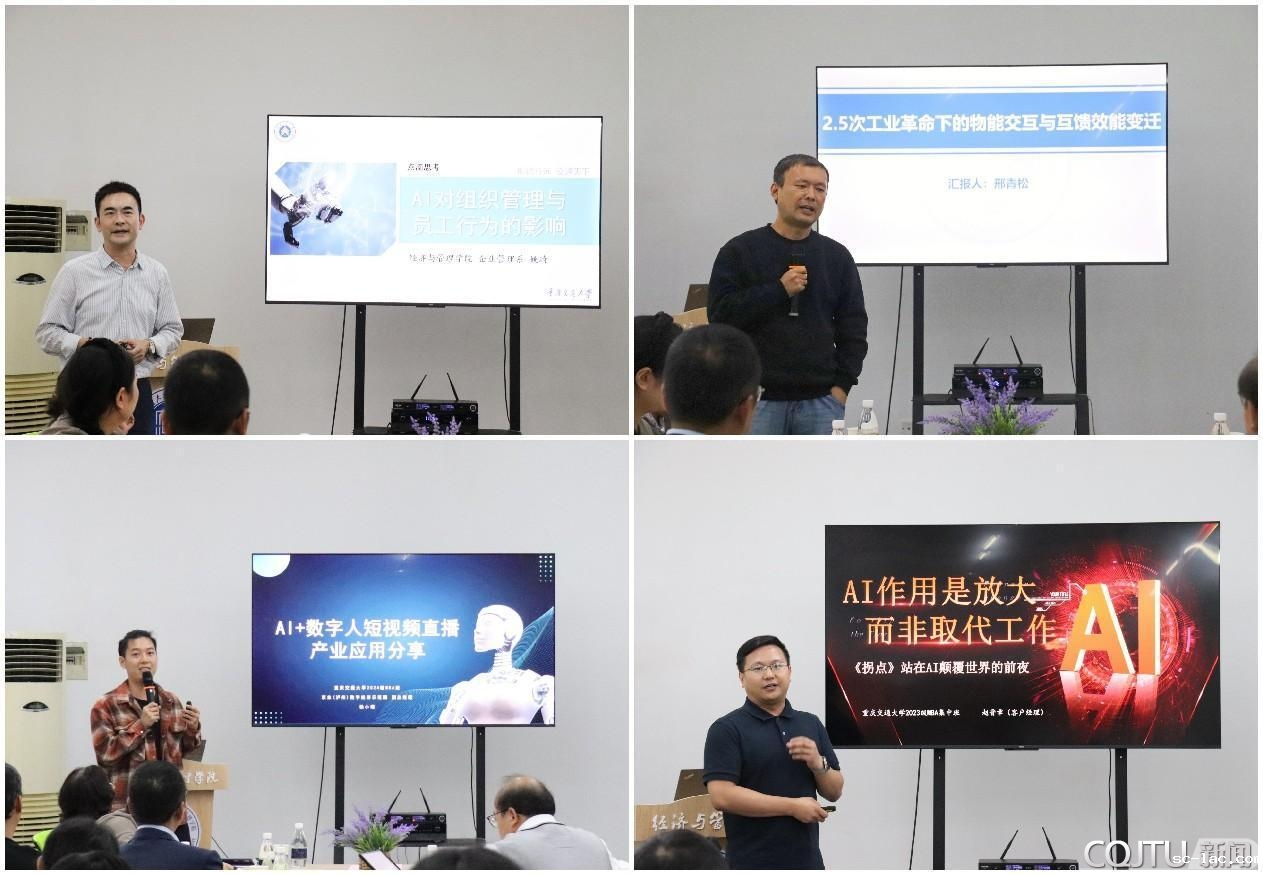 分享会先后邀请经管学院工商管理学科带头人姚琦教授、民盟交大主委邢青松副教授、MBA学生徐小增和赵晋章分别围绕“AI对组织管理和员工行为的影响”“2.5次工业革命下的物能交互与互馈效能变迁”“AI+数字人短视频直播产业应用分享”“AI的作用是放大而非取代工作”进行读书主题分享,从前沿研究、底层逻辑及应用场景等多个维度阐释了AI对工作生活的深度影响。