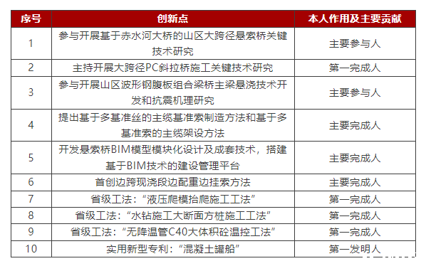 2003年开始,从四川宜宾到四川泸州的四百里水路,他带领团队完成了江安长江大桥、宜宾长江大桥、泸州茜草长江大桥、合江长江二桥,铸就了每百里一座长江大桥的特殊印迹。首创了双壁钢围堰水上整体拼装分节下沉及围堰内水下控制爆破技术,解决了无大型起重设备条件下深水厚覆盖层与嵌岩基础的施工难题。研发了PC斜拉桥预应力后支点挂篮、桁架式前支点挂篮等施工装备,实现了大节段PC梁悬浇挂篮的轻型化与无落地支架浇筑。在四川省率先大规模推广使用液压爬模,并在爬锥及模架结构上取得多项自主知识产权发明。