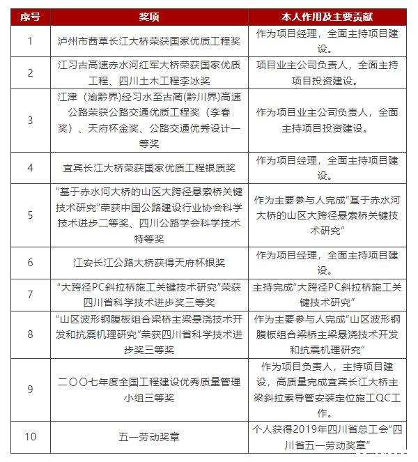 主持建设了建成时山区峡谷大桥世界第一高塔、世界第二跨径的悬索桥——江习古高速赤水河红军大桥、世界最大跨径公路悬浇拱桥——古金高速水落河特大桥、亚洲同类型桥梁中跨径最大的山区峡谷大桥——古金高速赤水河特大桥、万里长江第一桥——宜宾长江大桥等10余座有行业影响力桥梁。近年来,带领四川路桥获得古斯塔夫奖1项、国家优质工程奖5项、鲁班奖4项、詹天佑奖2项、国家科技进步奖1项,以及相关学会、协会的多项荣誉。