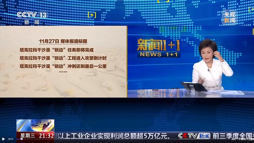 11月27日,央视新闻频道新闻1+1栏目以“塔克拉玛干沙漠治理,生态大事件!”为题,采访报道了塔克拉玛干沙漠锁边工程即将顺利“合龙”的热点话题。塔克拉玛干沙漠位于塔里木盆地中央,是我国面积最大的沙漠,总面积约为33.76万平方公里,环沙漠一圈的长度是3046公里。经过40多年的治理,截至2023年底,已经构筑起一道长达2761公里的阻沙防护带,还剩下285公里缺口。眼下,这剩下的285公里“锁边”任务即将全部完成。