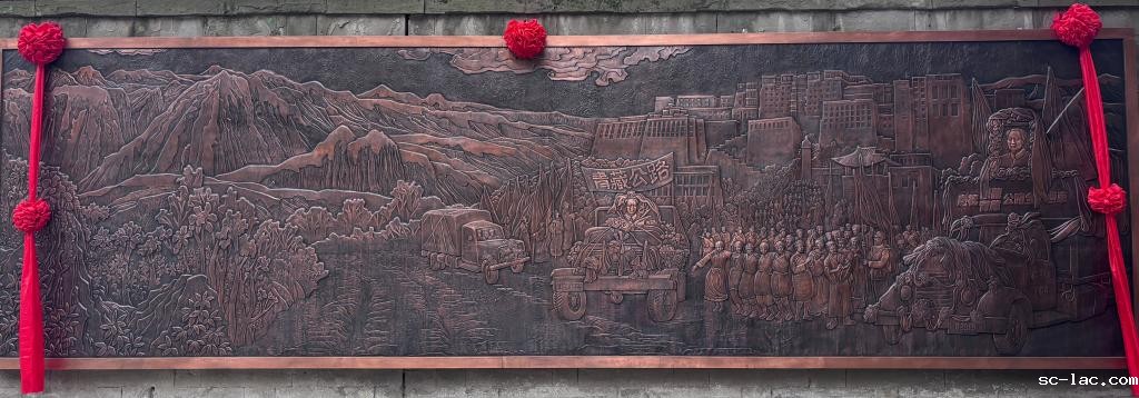 这块浮雕宽11米,高3.2米。1954年12月25日,从川藏公路和青藏公路开来的350多辆汽车缓缓进入布达拉宫前的广场,筑路军民、藏族同胞等各界代表三万多人在广场上载歌载舞,欢庆这一胜利时刻。