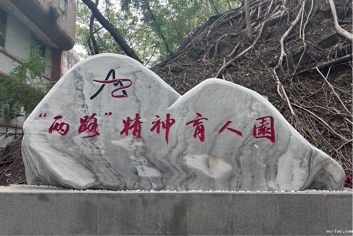 “两路”精神育人园7个苍劲有力的大字,由著名青年书法家王劲题写。石头左上角的是园区的标志,由象征川藏、青藏公路的两条丝带组成。