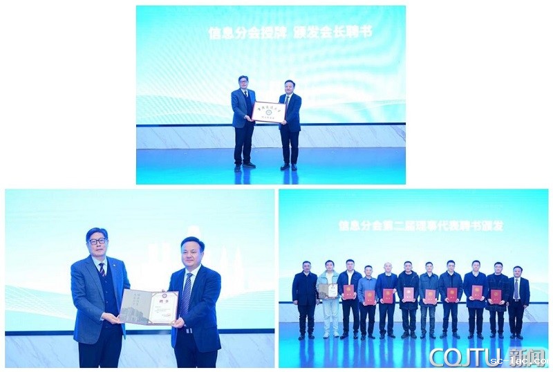 在授牌和颁发聘书环节,国家内河中心主任、校友会会长唐伯明为信息分会授牌,并向新当选的会长葛垚颁发了聘书。随后,任海涛部长和葛垚会长共同为信息分会第二届理事代表颁发了聘书,勉励他们在校友会工作中做出更大贡献。