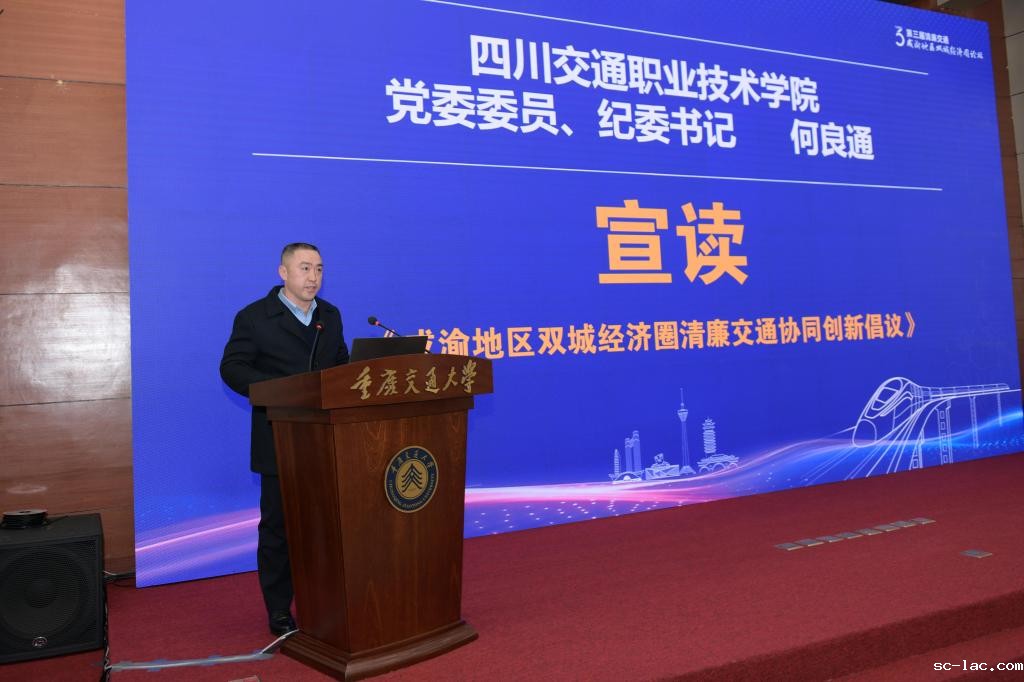 四川交通职业技术学院党委委员、纪委书记何良通宣布成立成渝地区双城经济圈清廉交通协同创新中心并宣读《成渝地区双城经济圈清廉交通协同创新宣言》,《宣言》内容涵盖“五要”:一要围绕中心、服务大局,加强合作交流;二要标本兼治,“三不腐”一体推进;三要开展深入研究,构建清廉建设新范式;四要全方位加强廉政教育,筑牢思想防线;五要坚守廉洁底线,推动企业诚信经营。《宣言》的发布为成渝地区双城经济圈交通事业点亮了清廉之光,也肩负着为区域协调发展保驾护航的重任,开启了两地交通领域风清气正、携手奋进的全新征程。