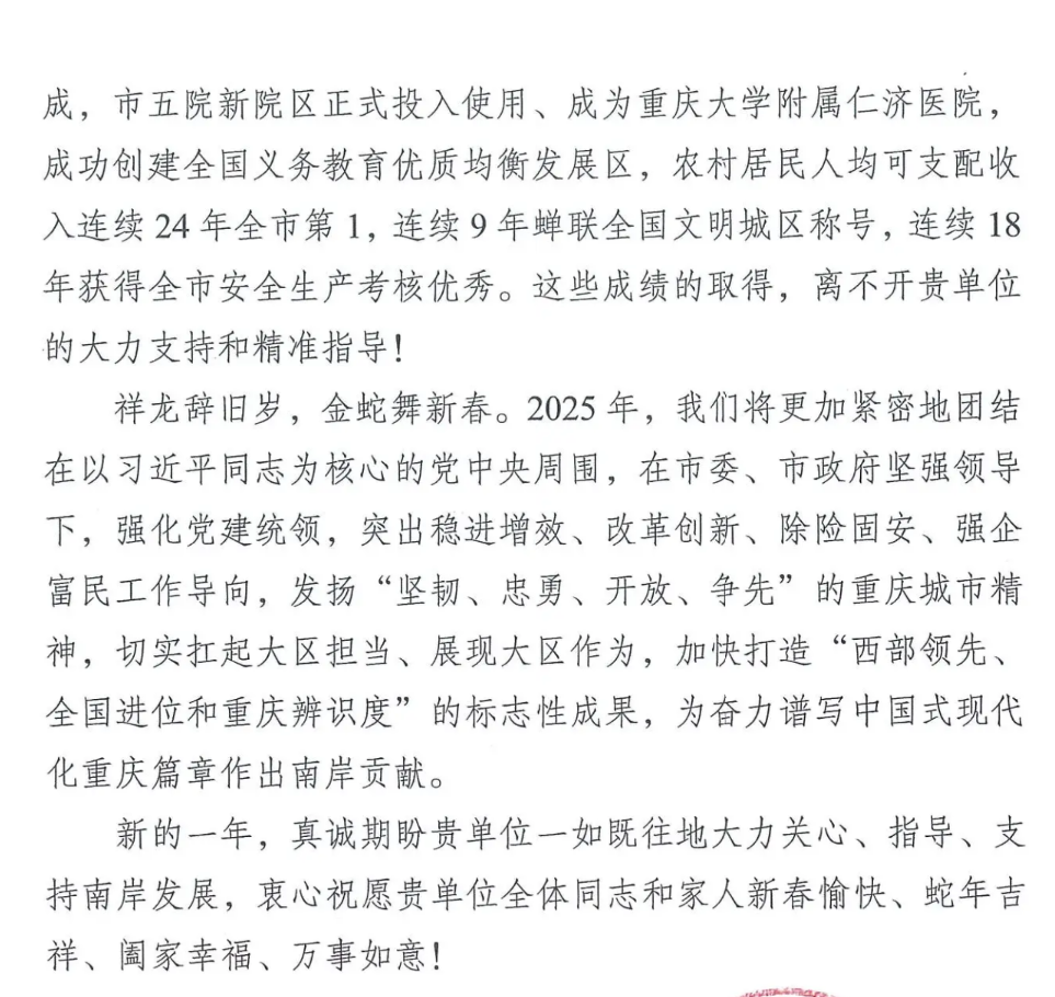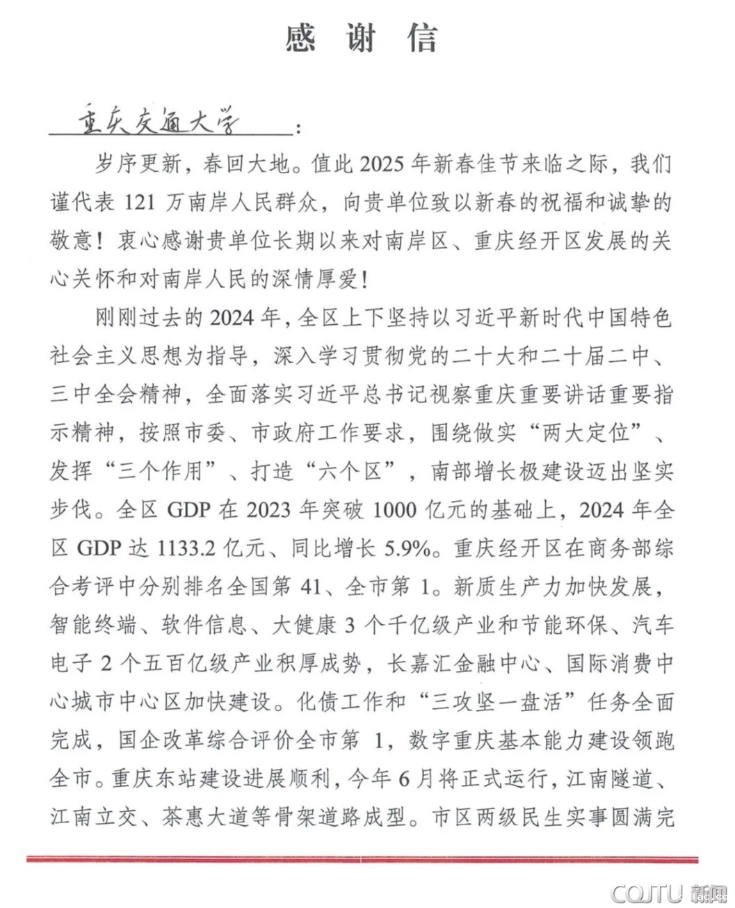 近日,老伟德网上娱乐收到中共重庆市南岸区委员会感谢信,对学校长期以来对南岸区、重庆经开区建设发展的支持表示感谢,全文如下。
