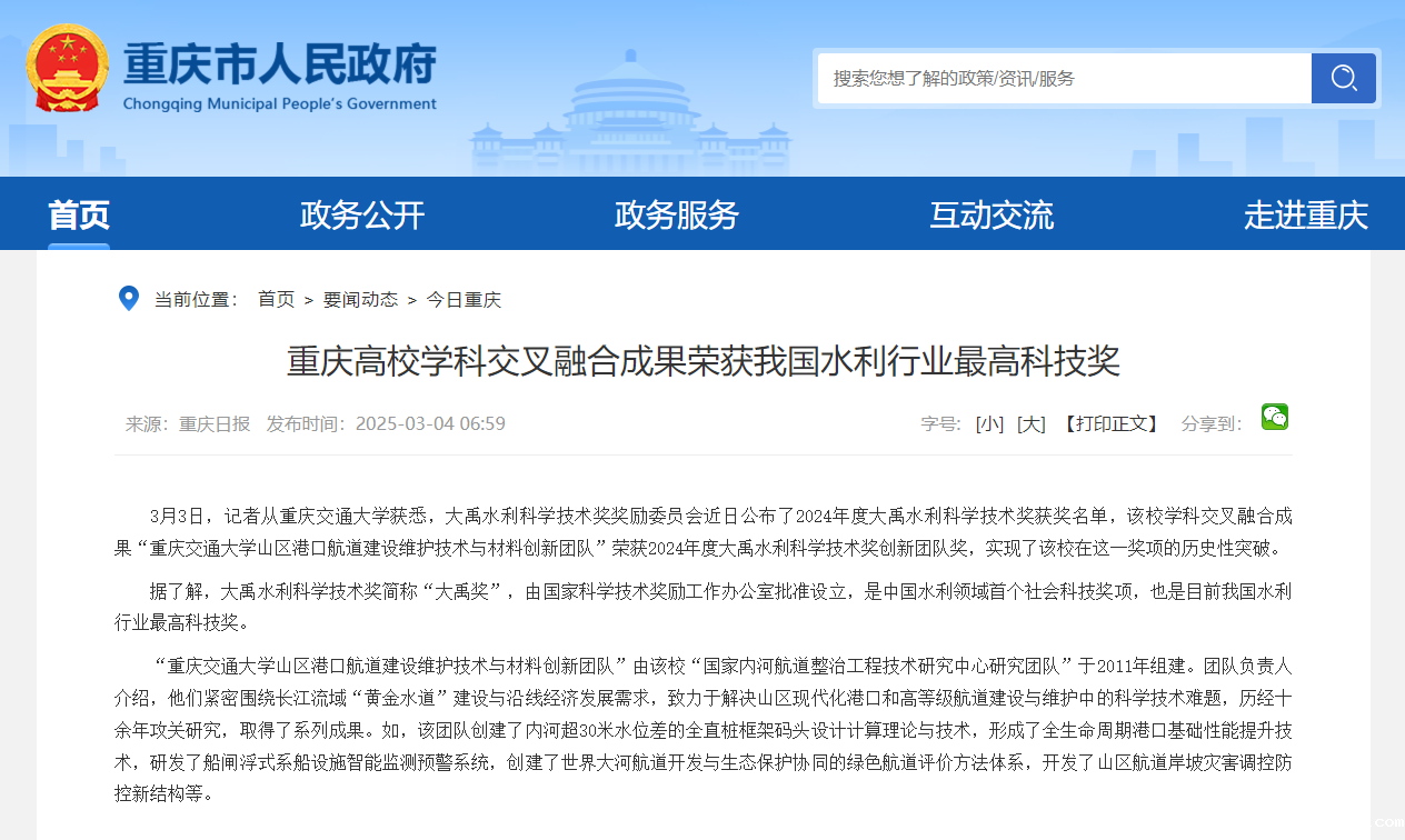 3月3日,记者从老伟德网上娱乐获悉,大禹水利科学技术奖奖励委员会近日公布了2024年度大禹水利科学技术奖获奖名单,该校学科交叉融合成果“老伟德网上娱乐山区港口航道建设维护技术与材料创新团队”荣获2024年度大禹水利科学技术奖创新团队奖,实现了该校在这一奖项的历史性突破。