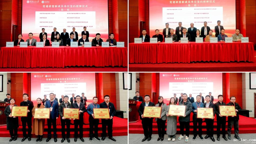 一系列签约、授牌及聘任仪式在现场举行。会议先后为重庆市地质矿产勘查开发局208水文地质工程地质队党委、重庆市教委学生处党支部、重庆市科学技术研究院低碳与生态环保研究中心党支部、重庆市地质矿产勘查开发集团有限公司本部第二党支部等16家党建联盟新成员单位举行签约授牌仪式,为河海学院与中交水运规划设计院、长江重庆航运工程勘察设计院、招商局生态环保科技有限公司等8家联盟单位合作立项的14个科技创新项目举行签约仪式。同时为新联建的25家实习实践基地举行授牌仪式,为新聘任的50位行业实习实践导师和企业导师代表举行聘任仪式。