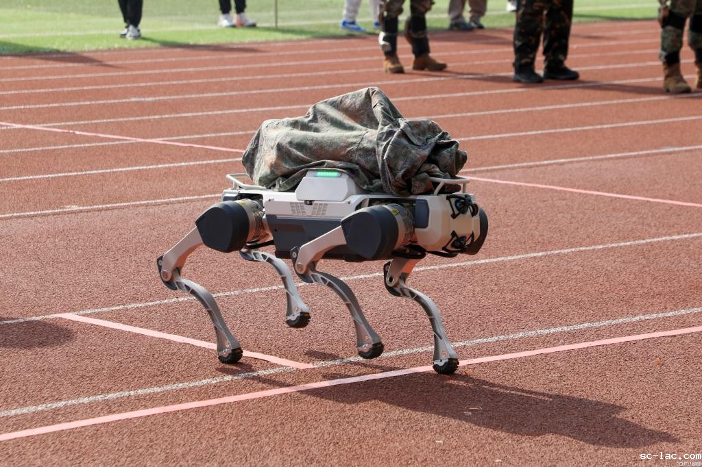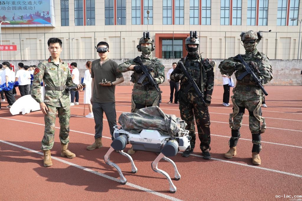 其中,机电与车辆工程学院方阵,无人机凌空翱翔,机器狗灵动穿梭,外骨骼“战士”(装备系模型)踏步向前。由黄彦钧同学团队自主研发的军工成果颇为亮眼:可搭载云爆火箭弹的无人机器狗昂首挺进,自研控制系统驱动穿越机可用于侦察。从交通强国到科技强国,交大青年以自主创新为引擎,将智能脉络深植国防与民生,生动演绎着“人机协同”的未来图景。