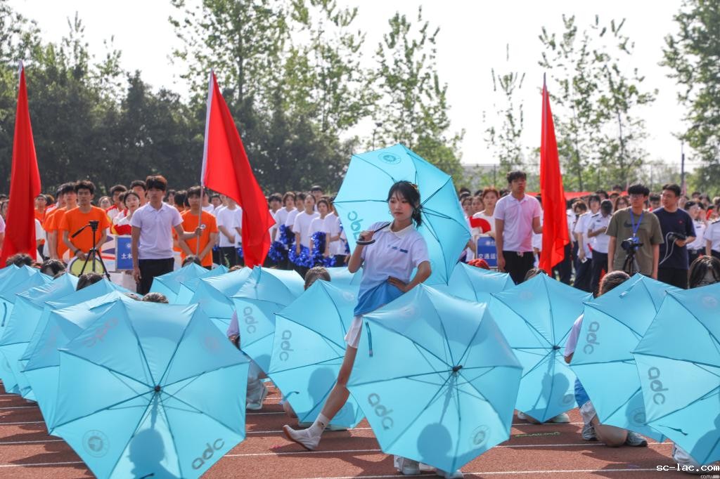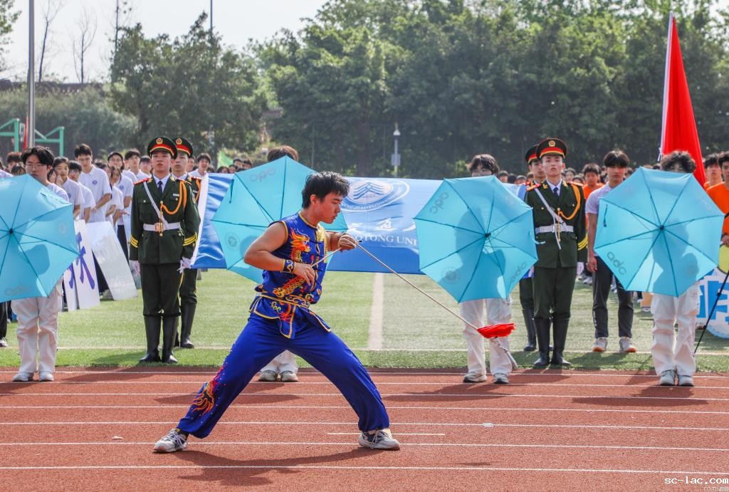 艺术设计学院以系列融合传统与现代元素的创意表演惊艳全场,带来了一场“视觉与文化”的双重盛宴。四位老师乘着时尚的平衡车率先登场,他们矫健的身姿与现代科技感十足的座驾融为一体。学生们手持蓝色小伞,彩伞在他们的手中轻盈旋转,色彩与动感交织,宛如绽放的鲜花。两位身着传统服饰的同学拳术动作行云流水、刚柔并济,展现出中华武术的博大精深;绳镖表演更将现场气氛推向了高潮,表演者手持长绳,末端系着镖头,时而迅猛甩出,长绳在空中划出一道道弧线,时而稳稳收回,镖头精准落回手中,动作干净利落、一气呵成。