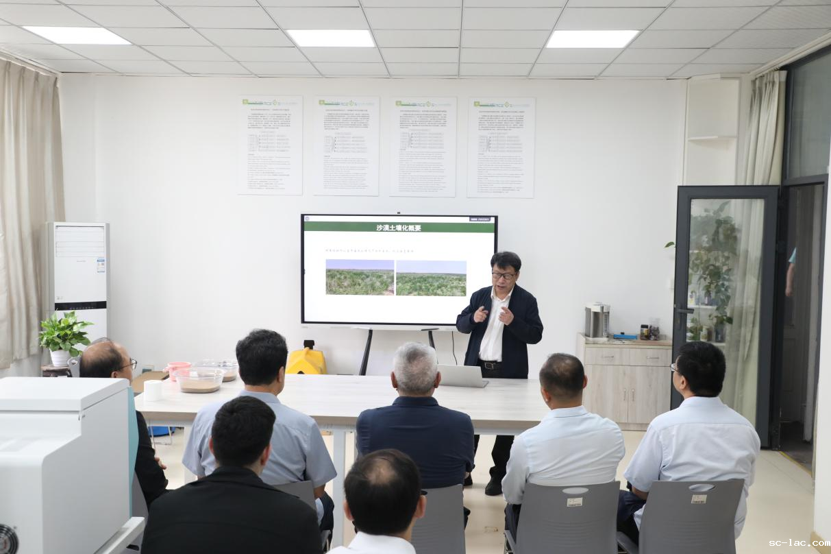 在沙漠生态研究院实验室,蒋庄德院士听取了易志坚教授对沙漠土壤化技术的简要介绍,现场观看了“沙改土”演示实验,并询问了解沙漠土壤化技术的材料生产、工程成本和推广应用情况。蒋庄德院士对沙漠土壤化技术研发应用成效表示高度认可,并鼓励技术团队进一步发挥技术优势、扩大应用场景和规模,更好地服务国家生态文明建设和经济社会绿色高质量发展。