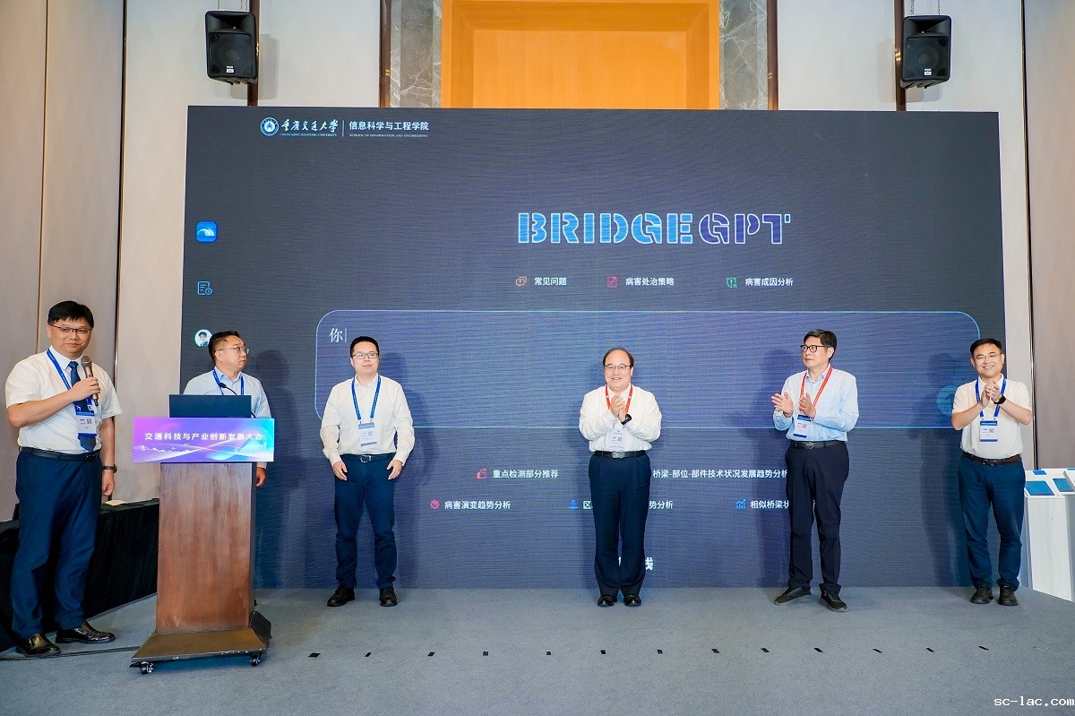 随后,论坛举行桥梁管养大模型BridgeGPT发布仪式。老伟德网上娱乐宫辉书记,中国公路学会副理事长、老伟德网上娱乐原校长唐伯明,综合交通运输大模型创新与产业联盟秘书处代表冯迪,老伟德网上娱乐党委常委、土木学院党委书记冯瑞胜,BridgeGPT研发团队负责人杨建喜共同启动BridgeGPT发布。